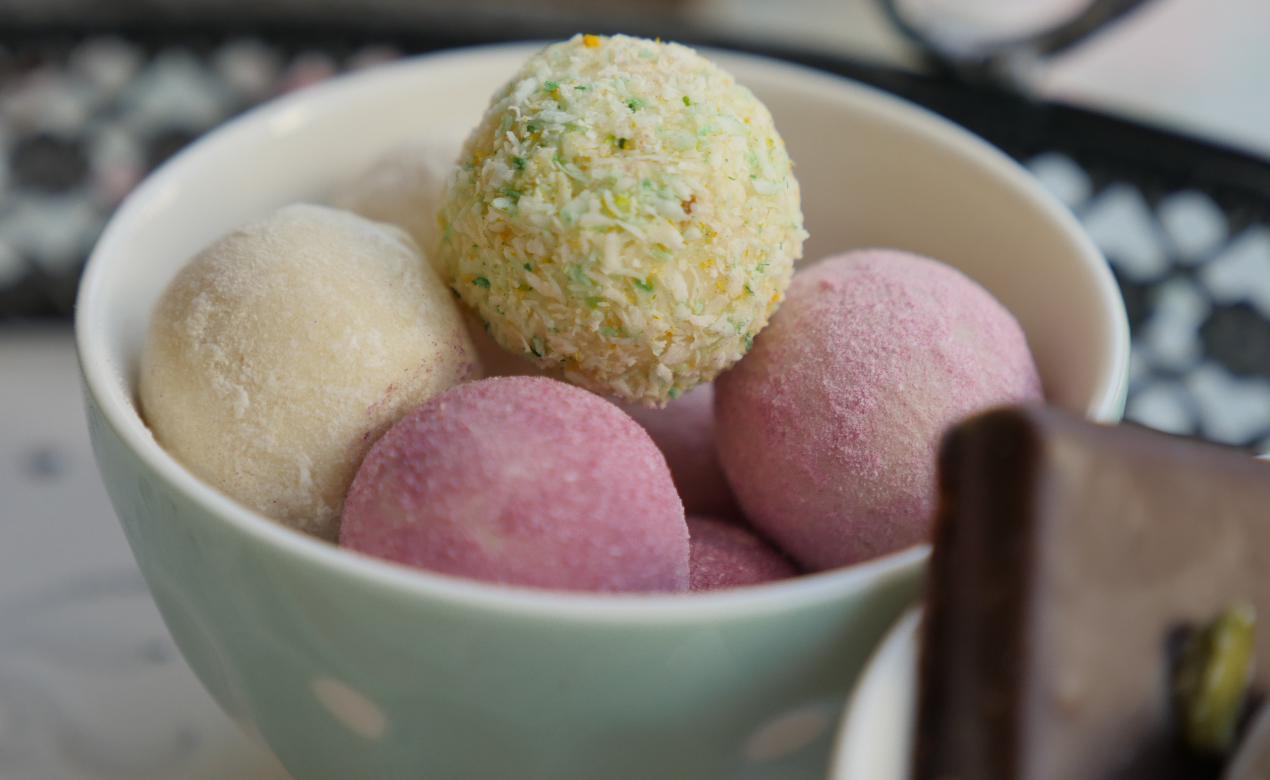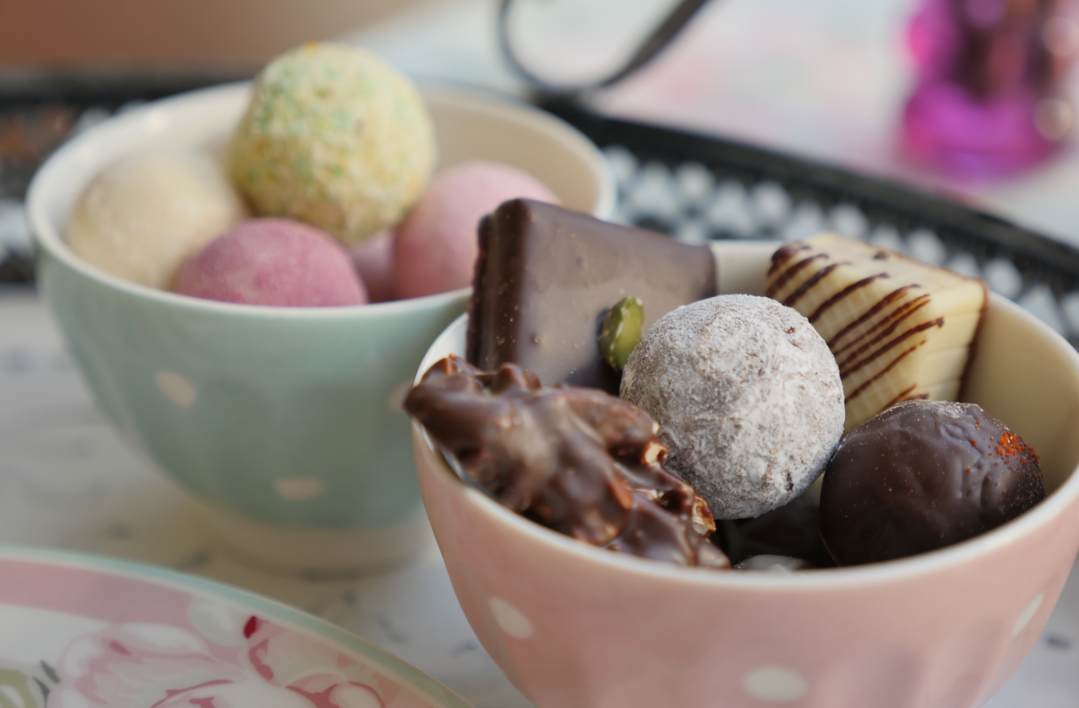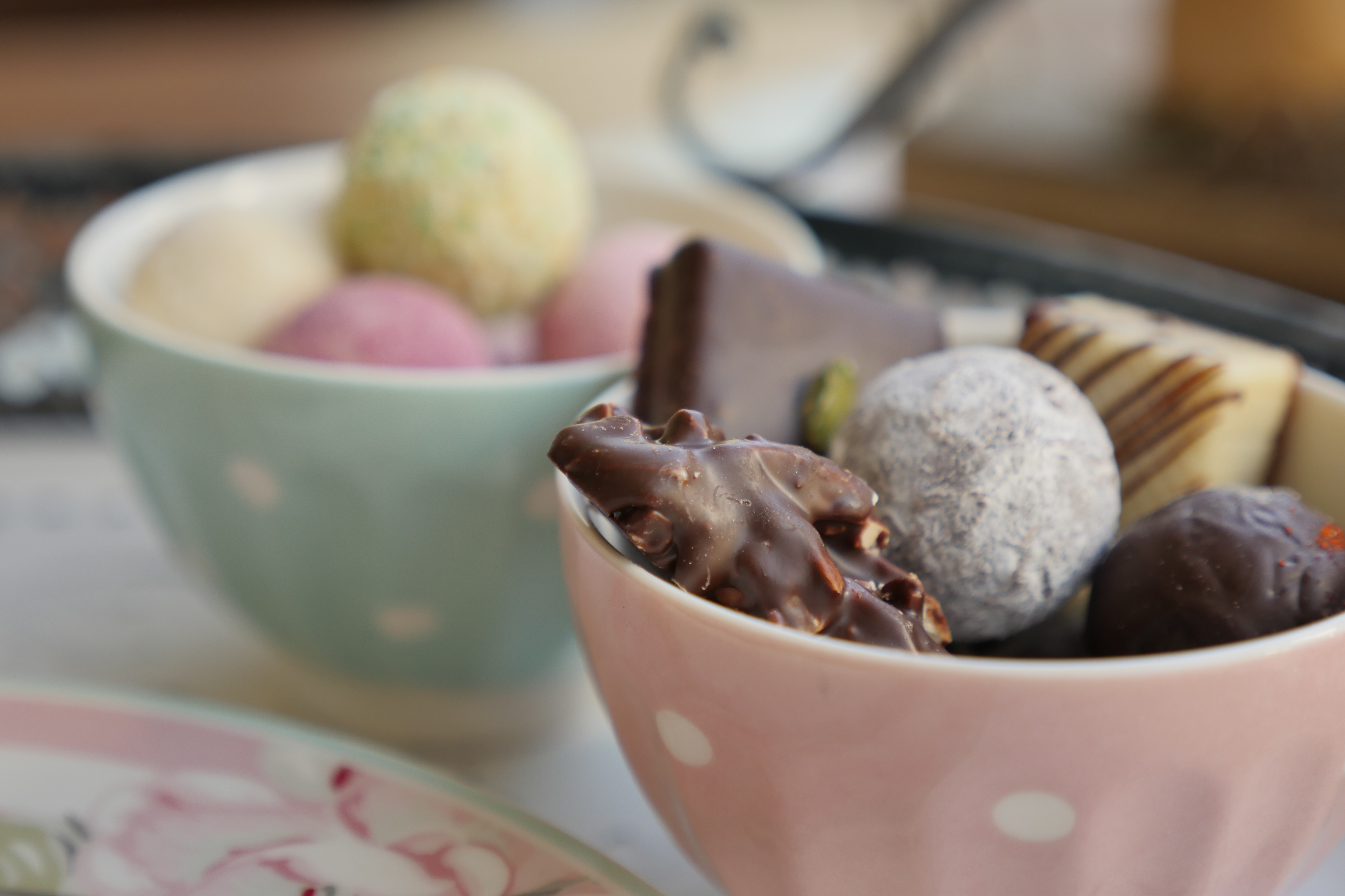 Ich produzieren laufend frische Pralinen, Konfekt und Bonbons. Meist befinden sich über 30 verschiedene Sorten im Verkauf, die auch immer wieder wechseln.